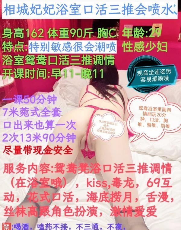 老师是从东莞过来的,课表写的主打服务。也挺便宜的3p5pp性价比不错,小区无摄像头自由进门。穿着一身黑丝开门等我,态度好倒了温开水给我喝。一开始就跳骚舞吸引我,手机放着暧昧的音乐,一边跳舞一边用手抚摸我的小弟,拿着我的手摸它的大胸,d罩杯有的,跳了几分钟我就躺着叫她服务了,口活有节奏,用嘴吞下整个蛋蛋,毒龙含着热水,舌头用力往里顶,整得菊花灿烂,老师的妹妹里面有肉齿,插进去咬的紧紧的,越草水越多,我选了2次,第一炮没多斤就交代了,第二次各种姿势,老师叫的更骚了,十几分钟后完事抽根烟就走了,爱好服务的来冲吧。