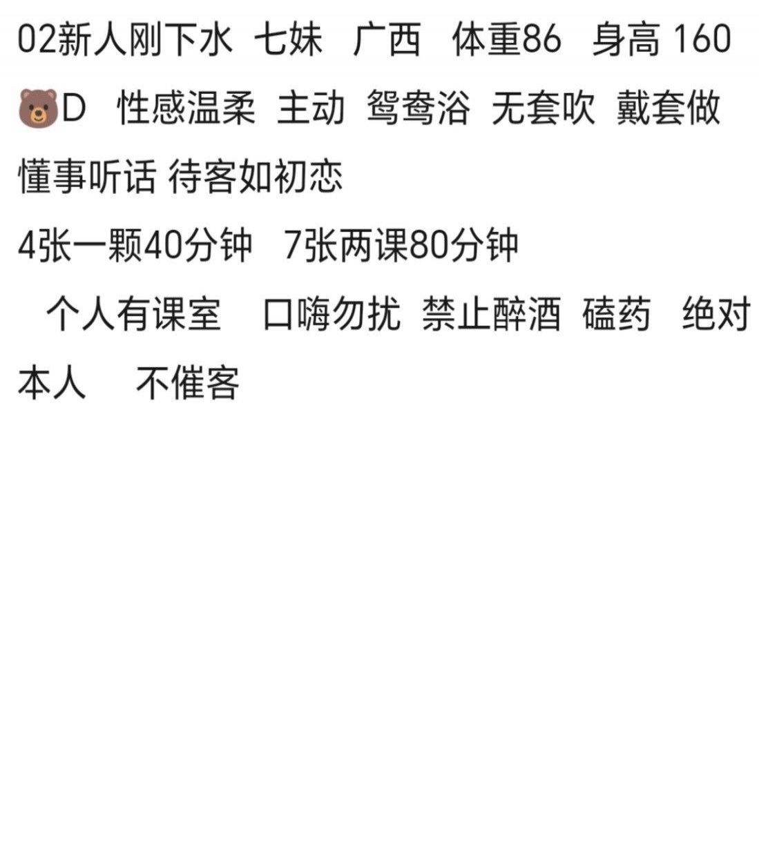 三刷了,感觉有点熟了快腻了,以后可能不去了。到地方遥控上楼,楼下有望风的,三四个合租,到了直接找苍苍,第一次的时候确实服务拉满,而且服务花样挺多的,两水,不行的兄弟可以试试。屁股圆润肥美非常适合后入打桩!