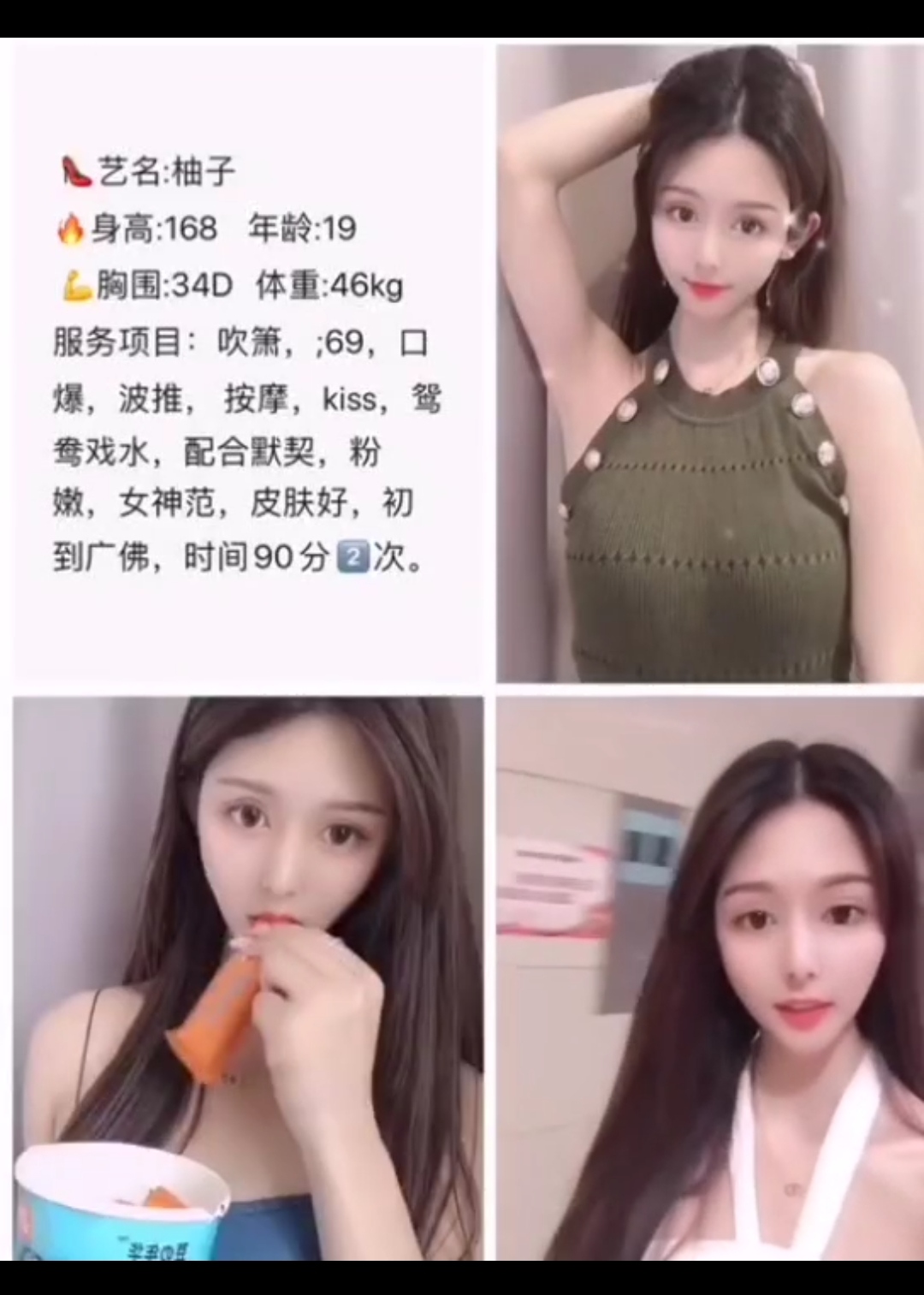 小姐姐。胸大屁股大。有轻微性瘾,天天都想被干。皮肤雪白。两个小白兔又白又嫩。奶头很敏感。69的时候水分很多。重点是深喉的时候。可以完全把头按着操。无套内射一种很享受,很销魂的感觉。