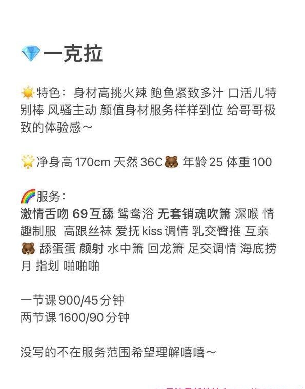 老师是从东莞过来的,课表写的主打服务。也挺便宜的3p5pp性价比不错,小区无摄像头自由进门。穿着一身黑丝开门等我,态度好倒了温开水给我喝。一开始就跳骚舞吸引我,手机放着暧昧的音乐,一边跳舞一边用手抚摸我的小弟,拿着我的手摸它的大胸,d罩杯有的,跳了几分钟我就躺着叫她服务了,口活有节奏,用嘴吞下整个蛋蛋,毒龙含着热水,舌头用力往里顶,整得菊花灿烂,老师的妹妹里面有肉齿,插进去咬的紧紧的,越草水越多,我选了2次,第一炮没多斤就交代了,第二次各种姿势,老师叫的更骚了,十几分钟后完事抽根烟就走了,爱好服务的来冲吧。