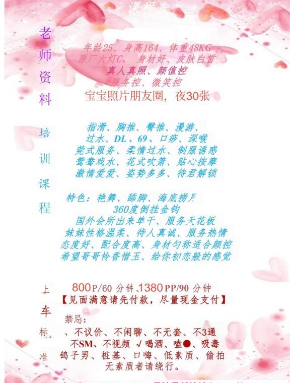 老师是从东莞过来的,课表写的主打服务。也挺便宜的3p5pp性价比不错,小区无摄像头自由进门。穿着一身黑丝开门等我,态度好倒了温开水给我喝。一开始就跳骚舞吸引我,手机放着暧昧的音乐,一边跳舞一边用手抚摸我的小弟,拿着我的手摸它的大胸,d罩杯有的,跳了几分钟我就躺着叫她服务了,口活有节奏,用嘴吞下整个蛋蛋,毒龙含着热水,舌头用力往里顶,整得菊花灿烂,老师的妹妹里面有肉齿,插进去咬的紧紧的,越草水越多,我选了2次,第一炮没多斤就交代了,第二次各种姿势,老师叫的更骚了,十几分钟后完事抽根烟就走了,爱好服务的来冲吧。