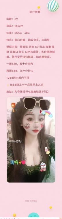 包夜三次了,之前在九亭,搬到闵行了。服务没的说,胸很有弹性。毒龙也不敷衍,第二次去可以优惠