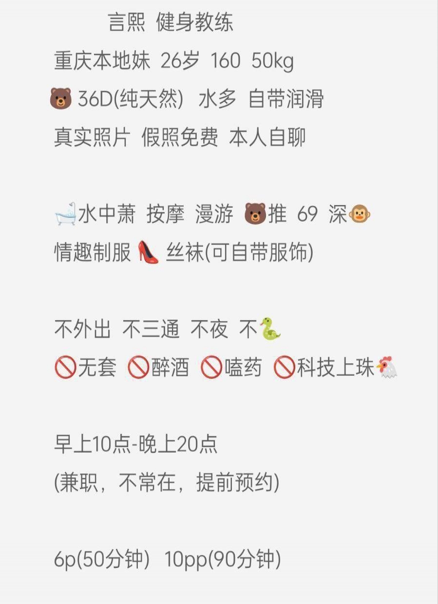 老师是从东莞过来的,课表写的主打服务。也挺便宜的3p5pp性价比不错,小区无摄像头自由进门。穿着一身黑丝开门等我,态度好倒了温开水给我喝。一开始就跳骚舞吸引我,手机放着暧昧的音乐,一边跳舞一边用手抚摸我的小弟,拿着我的手摸它的大胸,d罩杯有的,跳了几分钟我就躺着叫她服务了,口活有节奏,用嘴吞下整个蛋蛋,毒龙含着热水,舌头用力往里顶,整得菊花灿烂,老师的妹妹里面有肉齿,插进去咬的紧紧的,越草水越多,我选了2次,第一炮没多斤就交代了,第二次各种姿势,老师叫的更骚了,十几分钟后完事抽根烟就走了,爱好服务的来冲吧。