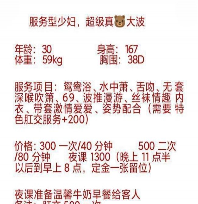 老师是从东莞过来的,课表写的主打服务。也挺便宜的3p5pp性价比不错,小区无摄像头自由进门。穿着一身黑丝开门等我,态度好倒了温开水给我喝。一开始就跳骚舞吸引我,手机放着暧昧的音乐,一边跳舞一边用手抚摸我的小弟,拿着我的手摸它的大胸,d罩杯有的,跳了几分钟我就躺着叫她服务了,口活有节奏,用嘴吞下整个蛋蛋,毒龙含着热水,舌头用力往里顶,整得菊花灿烂,老师的妹妹里面有肉齿,插进去咬的紧紧的,越草水越多,我选了2次,第一炮没多斤就交代了,第二次各种姿势,老师叫的更骚了,十几分钟后完事抽根烟就走了,爱好服务的来冲吧。