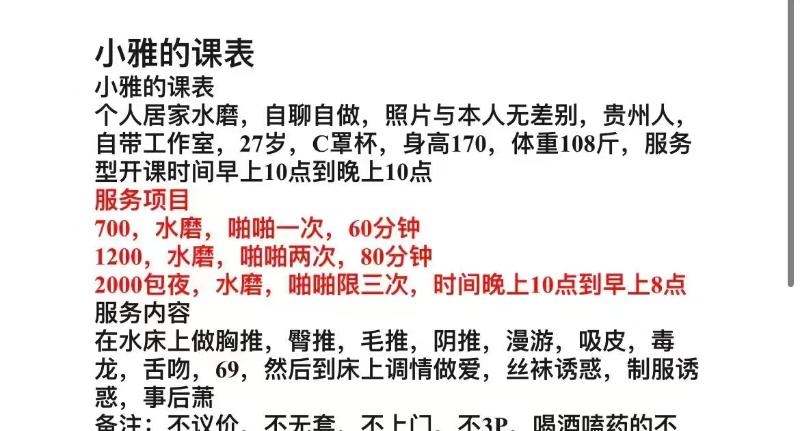 老师是从东莞过来的,课表写的主打服务。也挺便宜的3p5pp性价比不错,小区无摄像头自由进门。穿着一身黑丝开门等我,态度好倒了温开水给我喝。一开始就跳骚舞吸引我,手机放着暧昧的音乐,一边跳舞一边用手抚摸我的小弟,拿着我的手摸它的大胸,d罩杯有的,跳了几分钟我就躺着叫她服务了,口活有节奏,用嘴吞下整个蛋蛋,毒龙含着热水,舌头用力往里顶,整得菊花灿烂,老师的妹妹里面有肉齿,插进去咬的紧紧的,越草水越多,我选了2次,第一炮没多斤就交代了,第二次各种姿势,老师叫的更骚了,十几分钟后完事抽根烟就走了,爱好服务的来冲吧。