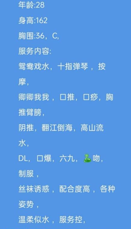 老师是从东莞过来的,课表写的主打服务。也挺便宜的3p5pp性价比不错,小区无摄像头自由进门。穿着一身黑丝开门等我,态度好倒了温开水给我喝。一开始就跳骚舞吸引我,手机放着暧昧的音乐,一边跳舞一边用手抚摸我的小弟,拿着我的手摸它的大胸,d罩杯有的,跳了几分钟我就躺着叫她服务了,口活有节奏,用嘴吞下整个蛋蛋,毒龙含着热水,舌头用力往里顶,整得菊花灿烂,老师的妹妹里面有肉齿,插进去咬的紧紧的,越草水越多,我选了2次,第一炮没多斤就交代了,第二次各种姿势,老师叫的更骚了,十几分钟后完事抽根烟就走了,爱好服务的来冲吧。
