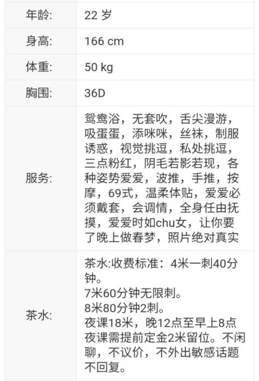 老师是从东莞过来的,课表写的主打服务。也挺便宜的3p5pp性价比不错,小区无摄像头自由进门。穿着一身黑丝开门等我,态度好倒了温开水给我喝。一开始就跳骚舞吸引我,手机放着暧昧的音乐,一边跳舞一边用手抚摸我的小弟,拿着我的手摸它的大胸,d罩杯有的,跳了几分钟我就躺着叫她服务了,口活有节奏,用嘴吞下整个蛋蛋,毒龙含着热水,舌头用力往里顶,整得菊花灿烂,老师的妹妹里面有肉齿,插进去咬的紧紧的,越草水越多,我选了2次,第一炮没多斤就交代了,第二次各种姿势,老师叫的更骚了,十几分钟后完事抽根烟就走了,爱好服务的来冲吧。