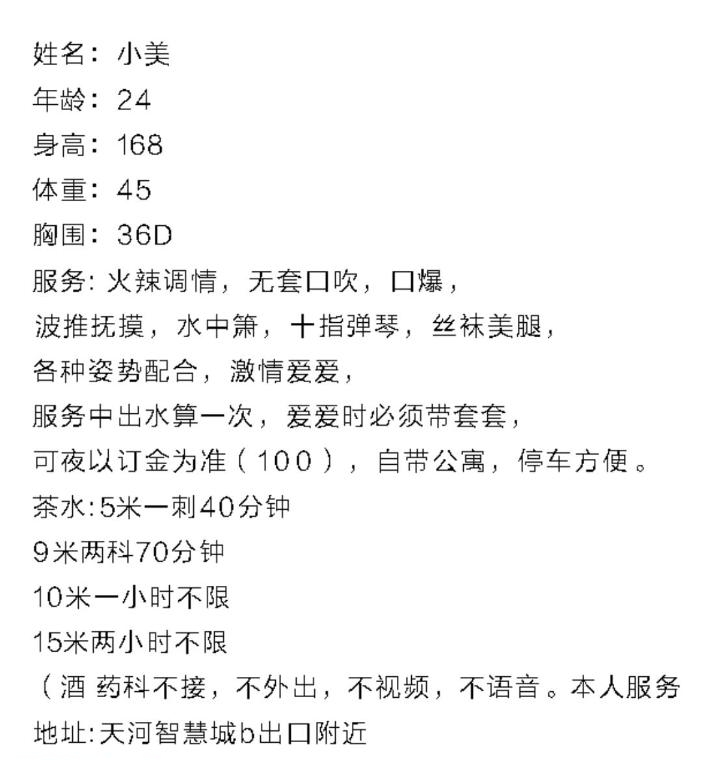老师是从东莞过来的,课表写的主打服务。也挺便宜的3p5pp性价比不错,小区无摄像头自由进门。穿着一身黑丝开门等我,态度好倒了温开水给我喝。一开始就跳骚舞吸引我,手机放着暧昧的音乐,一边跳舞一边用手抚摸我的小弟,拿着我的手摸它的大胸,d罩杯有的,跳了几分钟我就躺着叫她服务了,口活有节奏,用嘴吞下整个蛋蛋,毒龙含着热水,舌头用力往里顶,整得菊花灿烂,老师的妹妹里面有肉齿,插进去咬的紧紧的,越草水越多,我选了2次,第一炮没多斤就交代了,第二次各种姿势,老师叫的更骚了,十几分钟后完事抽根烟就走了,爱好服务的来冲吧。
